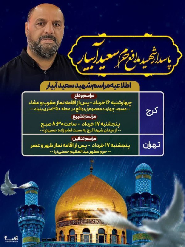 مراسم وداع با پیکر شهید سعید آبیار در شهر حسن آباد فشافویه لغو شد با توجه به برگزاری مراسم تشییع در روز چهارشنبه در استان البرز، آیین وداع و تشییع پیکر مطهر شهید سعید آبیار در شهر حسن آباد لغو شد. مکان و ساعت شروع مراسم تشییع پیکر این شهید والامقام برای…