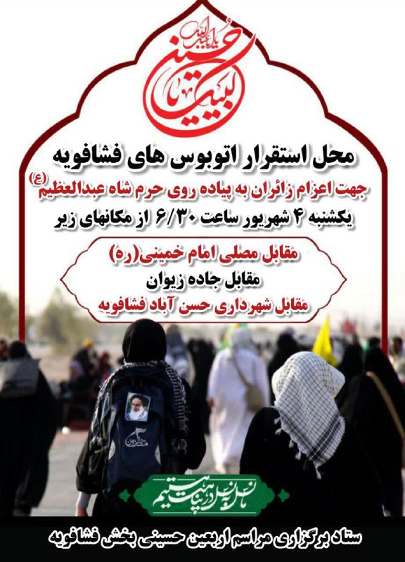 یکشنبه، ۴ شهریور، ساعت ۶/۳٠ صبح، از مکانهای زیر:
