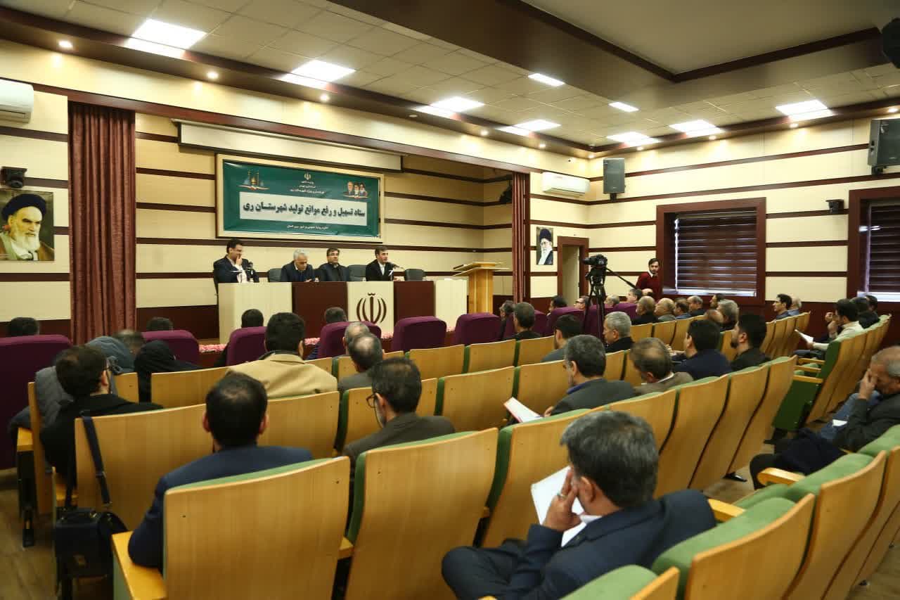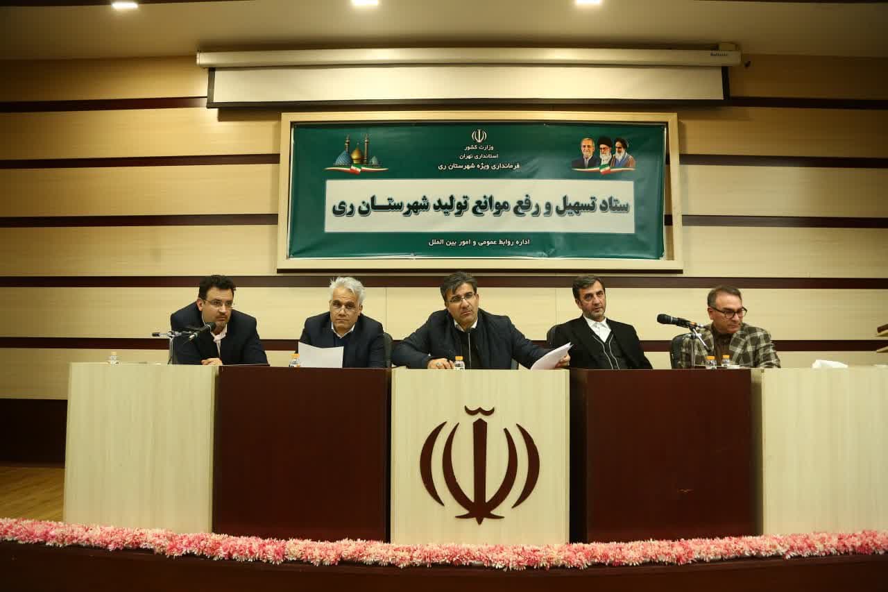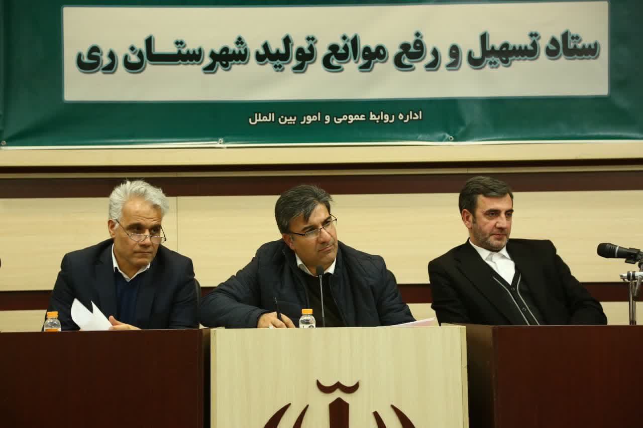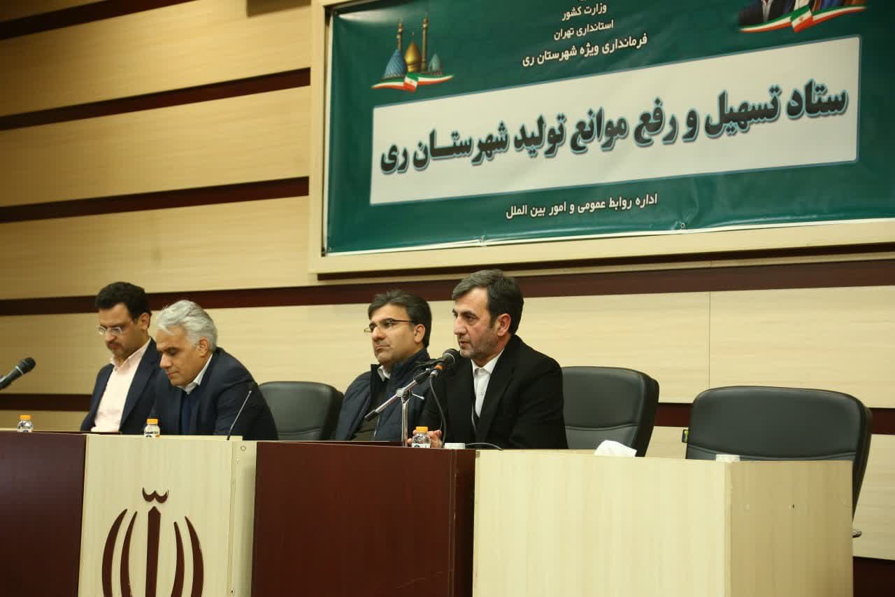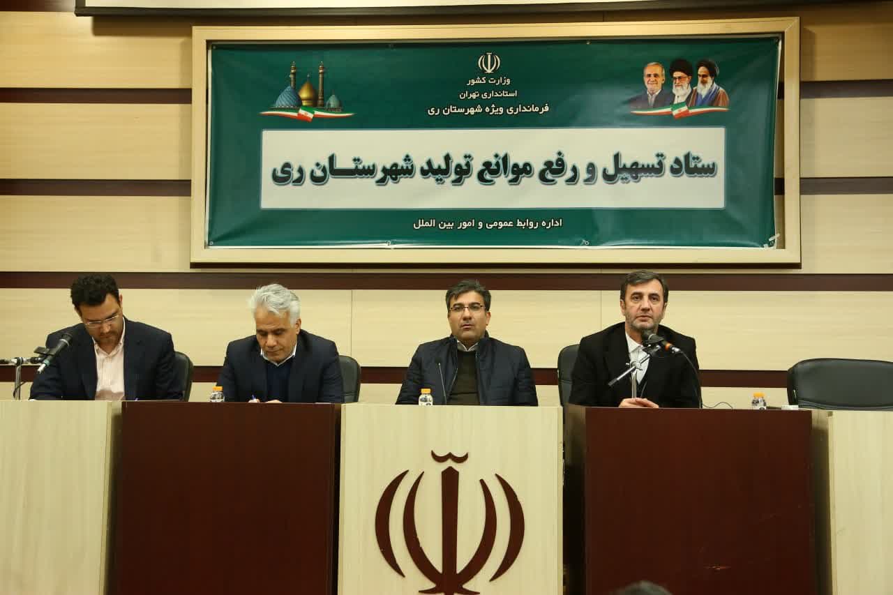 در ادامه این برنامه نشست ستاد تسهیل و رفع موانع تولید شهرستان ری به ریاست عسگری معاون هماهنگی امور اقتصادی استانداری تهران و باحضور جمعی از صنعتگران و تولیدکنندگان و مدیران کل استانی در محل تالار خدمت ساختمان فرمانداری ویژه شهرستان ری برگزار شد.