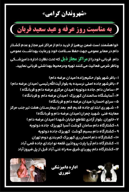 لیست مراکز مجاز عرضه و کشتار دام در شهرستان ری بمناسبت روز عرفه و عید سعید قربان