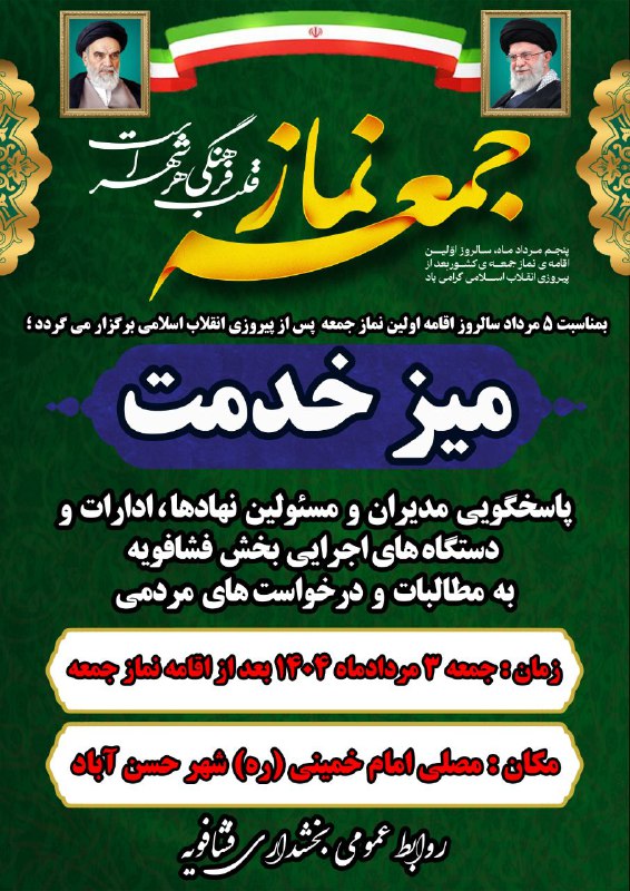 بمناسبت ۵ مرداد سالروز اقامه اولین نماز جمعه پس از پیروزی انقلاب اسلامی برگزار میگردد؛