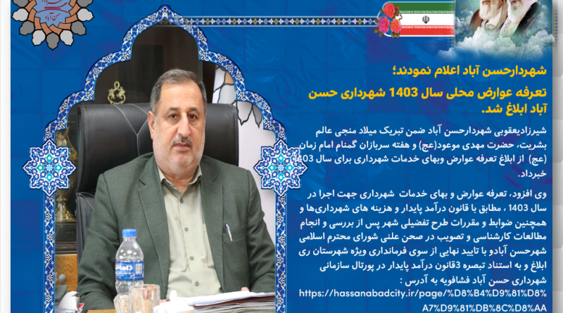 Read moreشهردارحسن آباد اعلام نمودند؛ تعرفه عوارض محلی سال 1403 شهرداری حسن آباد ابلاغ شد. شیرزادیعقوبی شهردارحسن آباد ضمن تبریک میلاد منجی عالم بشریت، حضرت مهدی موعود(عج) و هفته سربازان گمنام امام زمان (عج) از ابلاغ تعرفه عوارض وبهای خدمات شهرداری برای سال 1403 خبرداد. وی افزود، تعرفه عوارض و بهای خدمات شهرداری جهت اجرا در سال 1403 ، مطابق با قانون درآمد پایدار و هزینه های شهرداریها و همچنین ضوابط و مقررات طرح تفضیلی شهر پس از بررسی و انجام مطالعات کارشناسی و تصویب در صحن علنی شورای محترم اسلامی شهرحسن آبادو با تایید نهایی از سوی فرمانداری ویژه شهرستان ری ابلاغ و به استناد تبصره 3قانون درآمد پایدار در پورتال سازمانی شهرداری حسن آباد فشافویه به آدرس : //hassanabadcity.ir/page/%D8%B4%D9%81%D8%A7%D9%81%DB%8C%D8%AA اطلاع عموم رسیده است و از ابتدای سال 1403 لازم الاجرا خواهد بود.
