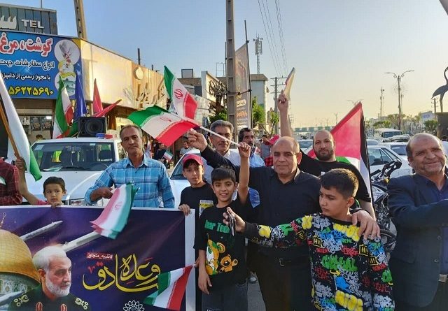 مردم مومن و خداجوی شهرستانهای استان تهران ساعتی پس از آغاز حملات سنگین سپاه پاسداران به مواضع دشمن صهیونیستی به خیابانها آمدند و حمایت خود را از مواضع شجاعانه کشورمان علیه جنایات رژیم ناپاک اسراییل را اعلام دادند.